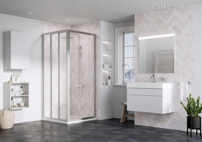 ДУШЕВОЙ УГОЛОК С НЕПОДВИЖНОЙ СТЕНКОЙ И ТРЕХЭЛЕМЕНТНОЙ РАЗДВИЖНОЙ ДВЕРЬЮ