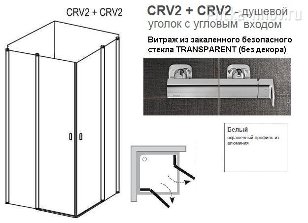 - Формируется путем объединения двух душевых дверей CRV2. Душевой уголок предлагает очень удобный вход 71 см.