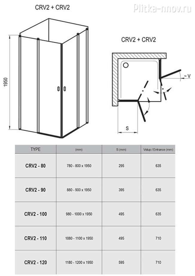 - Формируется путем объединения двух душевых дверей CRV2. Душевой уголок предлагает очень удобный вход 71 см.