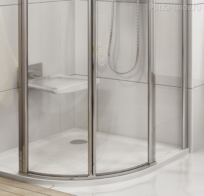 В безрамном полукруглом душевом уголке используются поворотные колонки и две двери предлагая удобный вход. Благодаря своей форме экономит пространство в ванной комнате при высоком качестве и изысканном дизайне.