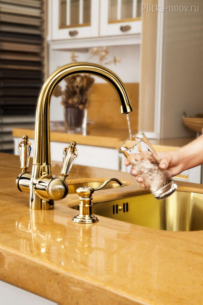 Винтажный дизайн и золотой цвет дозатора Omoikiri создают в ванной комнате и кухне атмосферу старинного шика. Аксессуар произведен из экологически чистого материала – латуни, не подвержен коррозии и механическим повреждениям. Плотное покрытие на основе гранитной крошки имеет однородную структуру и устойчиво к агрессивному воздействию химических веществ. Изделие сохраняет привлекательность на протяжении всего периода эксплуатации при минимальном уходе. Пластиковый флакон не разобьется при падении. Его легко заполнить моющим средством, подача которого осуществляется при нажатии на диспенсер. Максимальная толщина столешницы – 50 мм. Диаметр отверстия для установки – 25 мм.