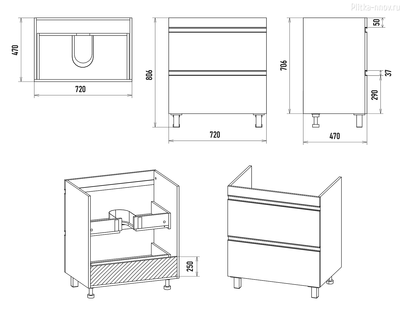Размер мебели, мм (ШxГxВ) 720x470x706