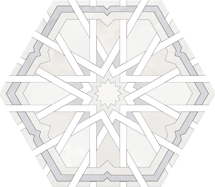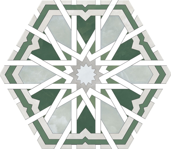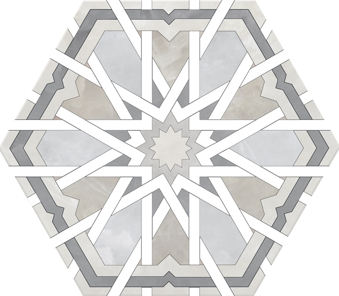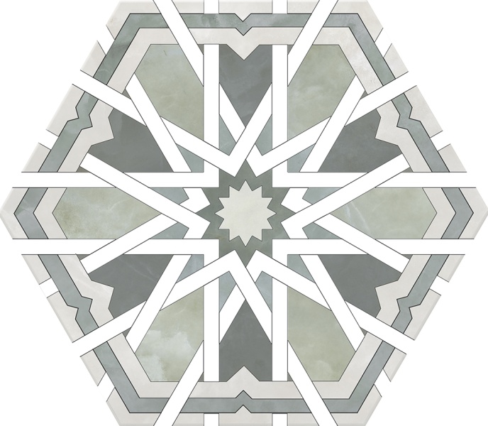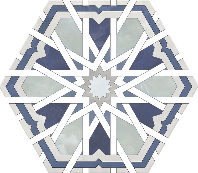 Страна Испания/  Производитель Monopole/  Количество Лиц - 1 / Рисунок - пэчворк / Основа - керамогранит/ Истираемость (PEI) - 4  / Форма -гексагон /  Поверхность - матовая/  Размер, см - 20х24