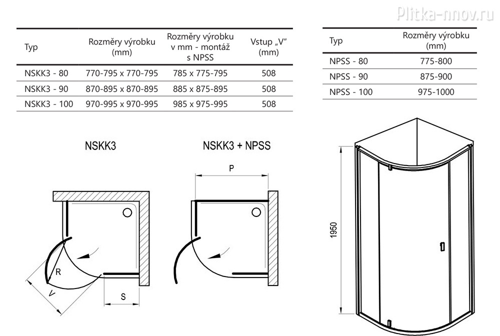 Диапазон регулировки: 970-995x970-995x1950 мм