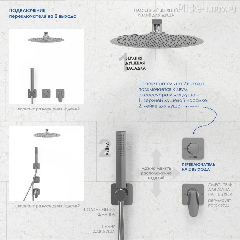 Переключатель на 2 выхода. Подключается к двум аксессуарам для душа на выбор: верхней душевой насадке, лейке для душа и настенному изливу. В зависимости от ваших предпочтений.