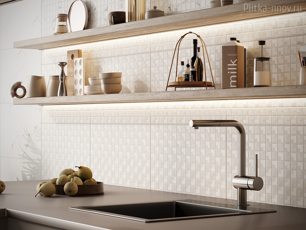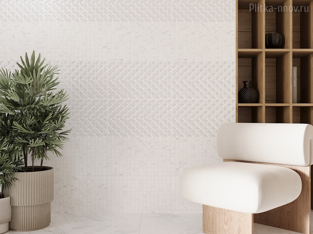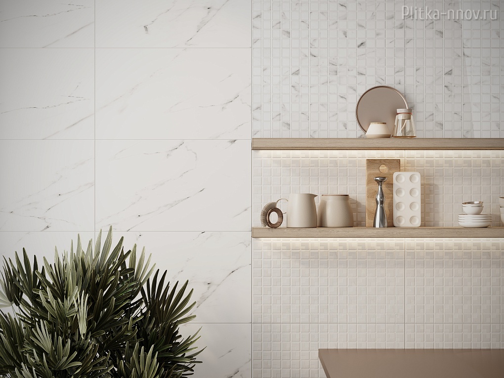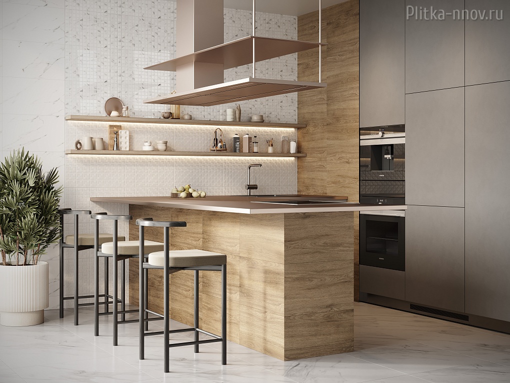 Коллекция со скандинавским настроением, которое задаёт сочетание белого мрамора и натурального дерева. Отличительная черта – баланс противоположностей: глянцевой поверхности с матовой, мраморной текстуры с деревянной, который достигается выверенным распределением ролей каждого элемента, как в оперном либретто. Основные цвета: белый с серыми прожилками и бежевый. Лаконичный состав элементов коллекции позволяет создавать светлые минималистичные интерьеры с отсылкой к натуральным мотивам. Текстура базовых плиток – натуральный мрамор Carrara, у акцентной – натуральное дерево. Декором в коллекции стала плитка с рельефом мозаики на которую перламутровой ветрозой нанесен объемный орнамент. Использование декоративных материалов на рельефе встречается достаточно редко, поэтому такой элемент в интерьере может добавить ему некоторой эксклюзивности. При укладке декора большим полотном создаётся ритмичный паттер шеврона, который задаёт направление и добавляет динамики всему пространству. Решением для оформления пола может стать комбинация из глянцевого керамогранита Celia привычного и простого в укладке формата 45х45 см с текстурой мрамора и керамогранита с имитацией дерева Oslo 12,5х50 см, которым можно зонировать мокрые зоны в ванных комнатах.