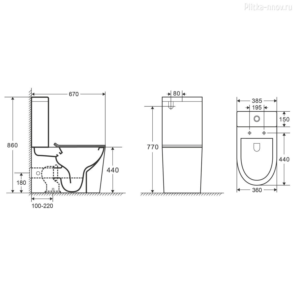 Комплектация унитаз керамический безободковый; бачок смывной керамический с нижним подводом воды; двухуровневый спускной механизм; сиденье для унитаза из дюропласта легкосъемное с функцией плавного закрывания; монтажный комплект; инструкция/гарантийный талон