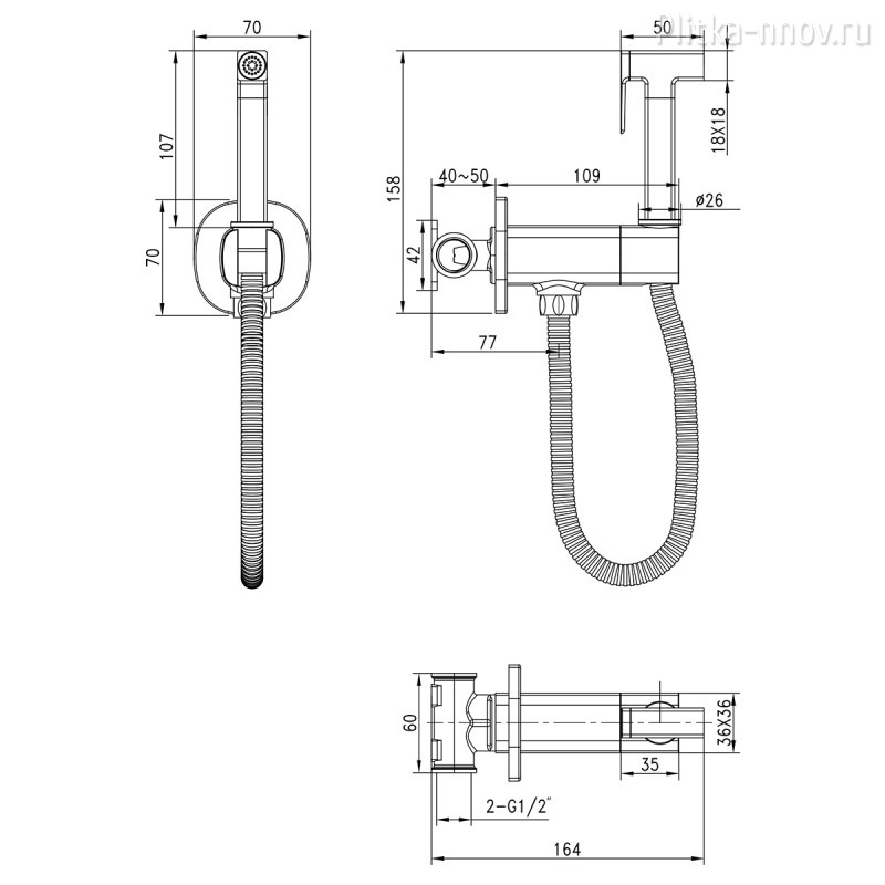 Аксессуары в комплекте: лейка гигиенического душа с нажимным механизмом, душевой шланг 1,2 м (Turn-Free)